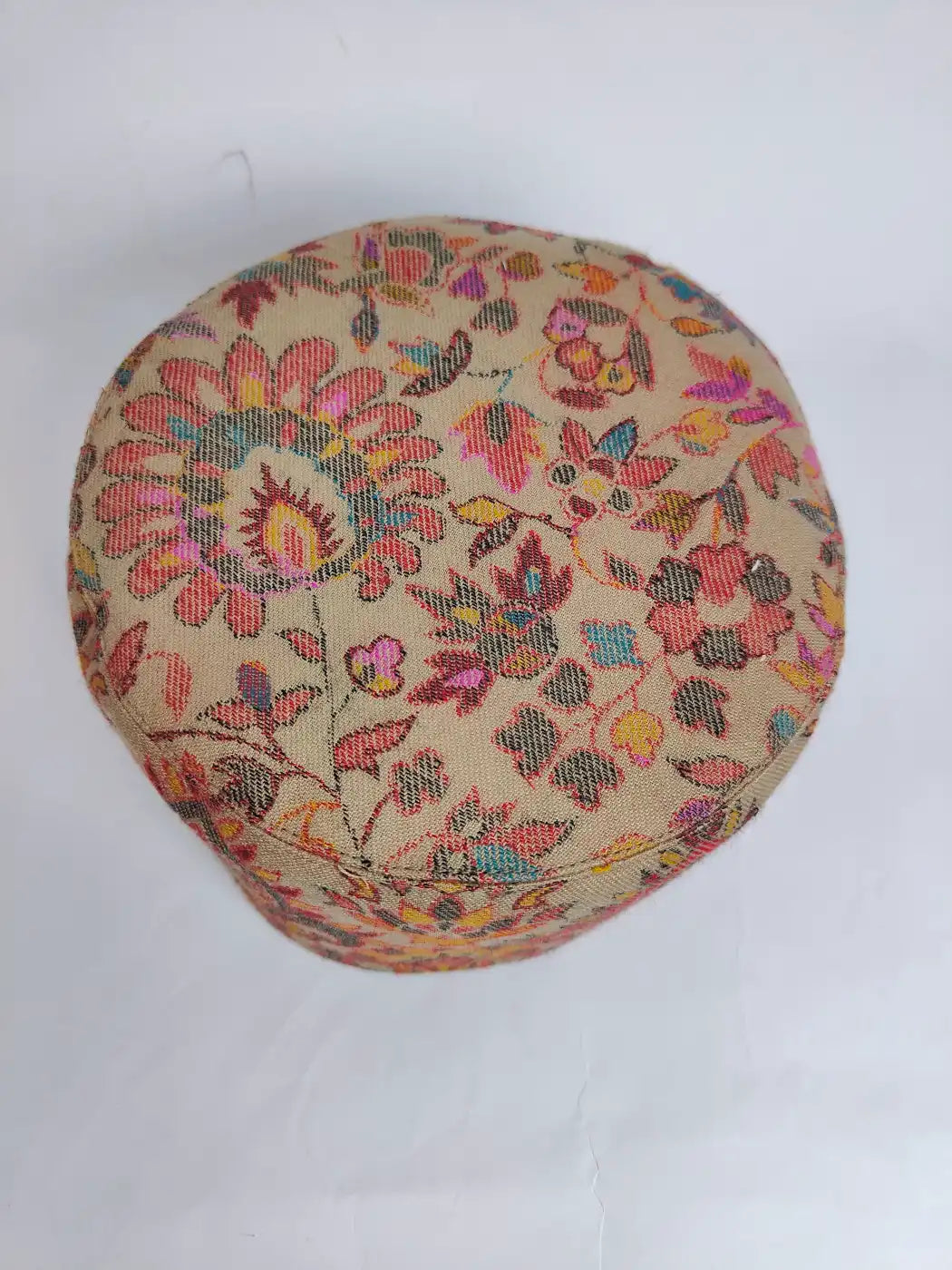 You can feel the quality of this kani cap moment you hold it. This beige topi is made from a woven Kani shawl, where floral patterns are already part of the fabric itself. Its detailing spreads all over with quiet richness.