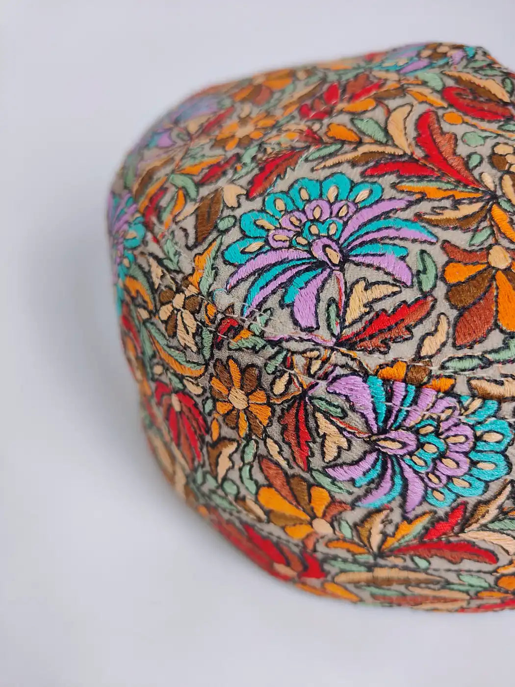 Created in wool, this beige colour classic cap carries heavy paper machie sozni needlework in floral motifs all over the cap to adorn the look. It is ideal for gatherings and special occasions.