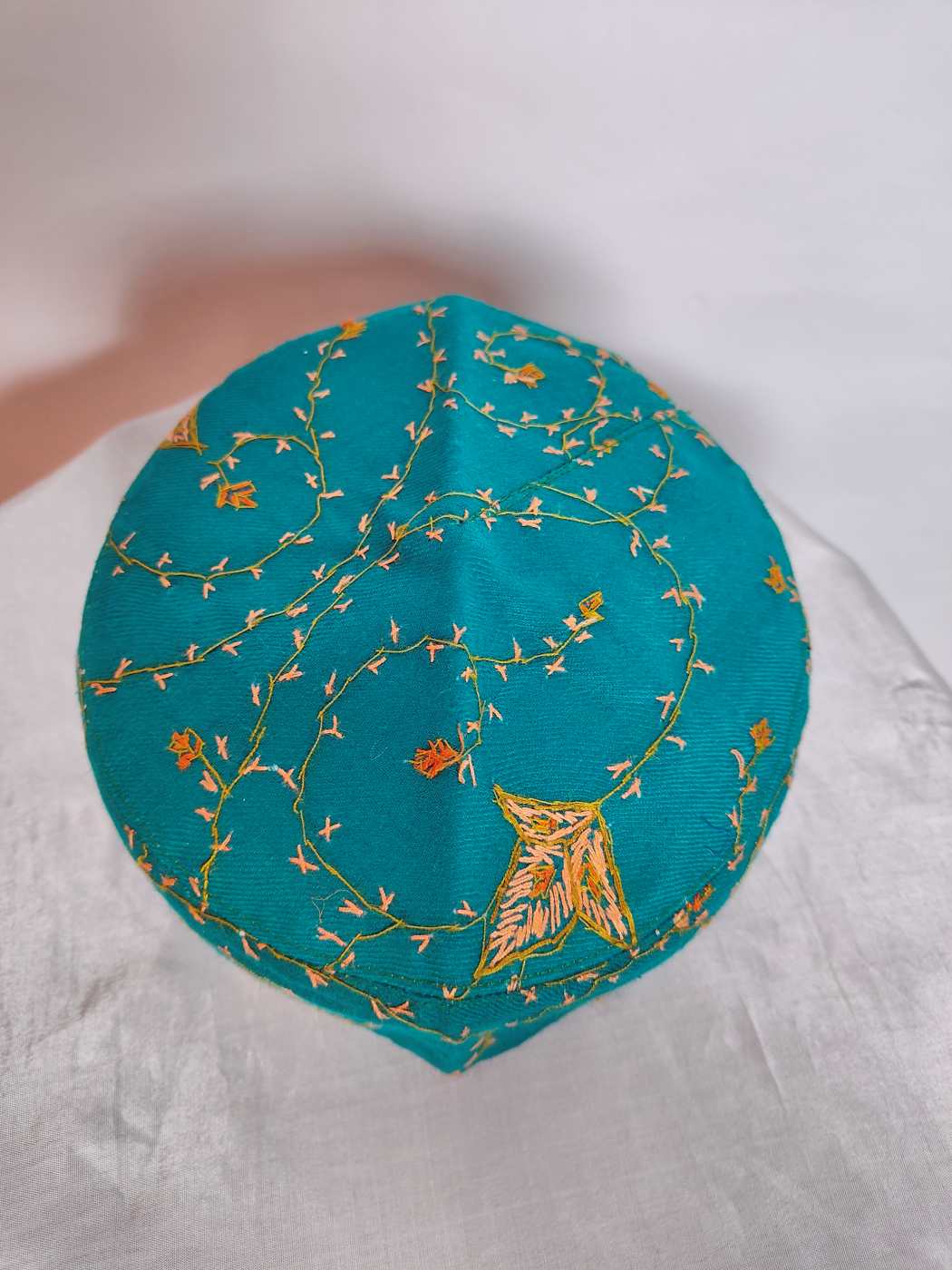 Crafted in sea green toosha, this men caps feature Kashmiri hand sozni embroidery showing fine heritage. It brings warmth, softness, and graceful winter style, suited for daily wear, gatherings, and traditional moments with comfort and refined charm for elegant appeal today.