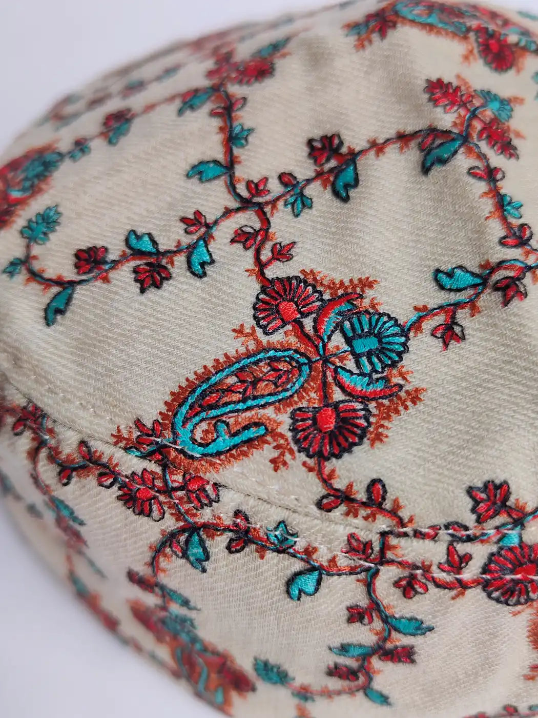 Crafted in wool for lovely appeal, this beige lightweight cap shows Kashmiri needlework with fine patterns. It offers tidy fitting, and cultural grace.