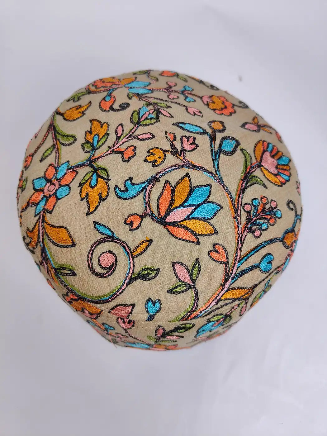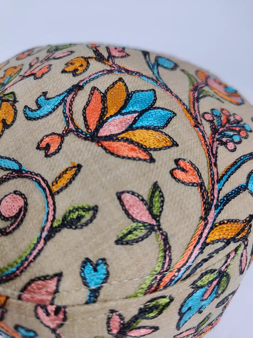 Made in wool for dignified wear, this beige caps for man show Kashmiri nalki aari embroidery in floral and vine motifs done with intricate detailing. It offers soft feel, good fitting, and crafted charm.
