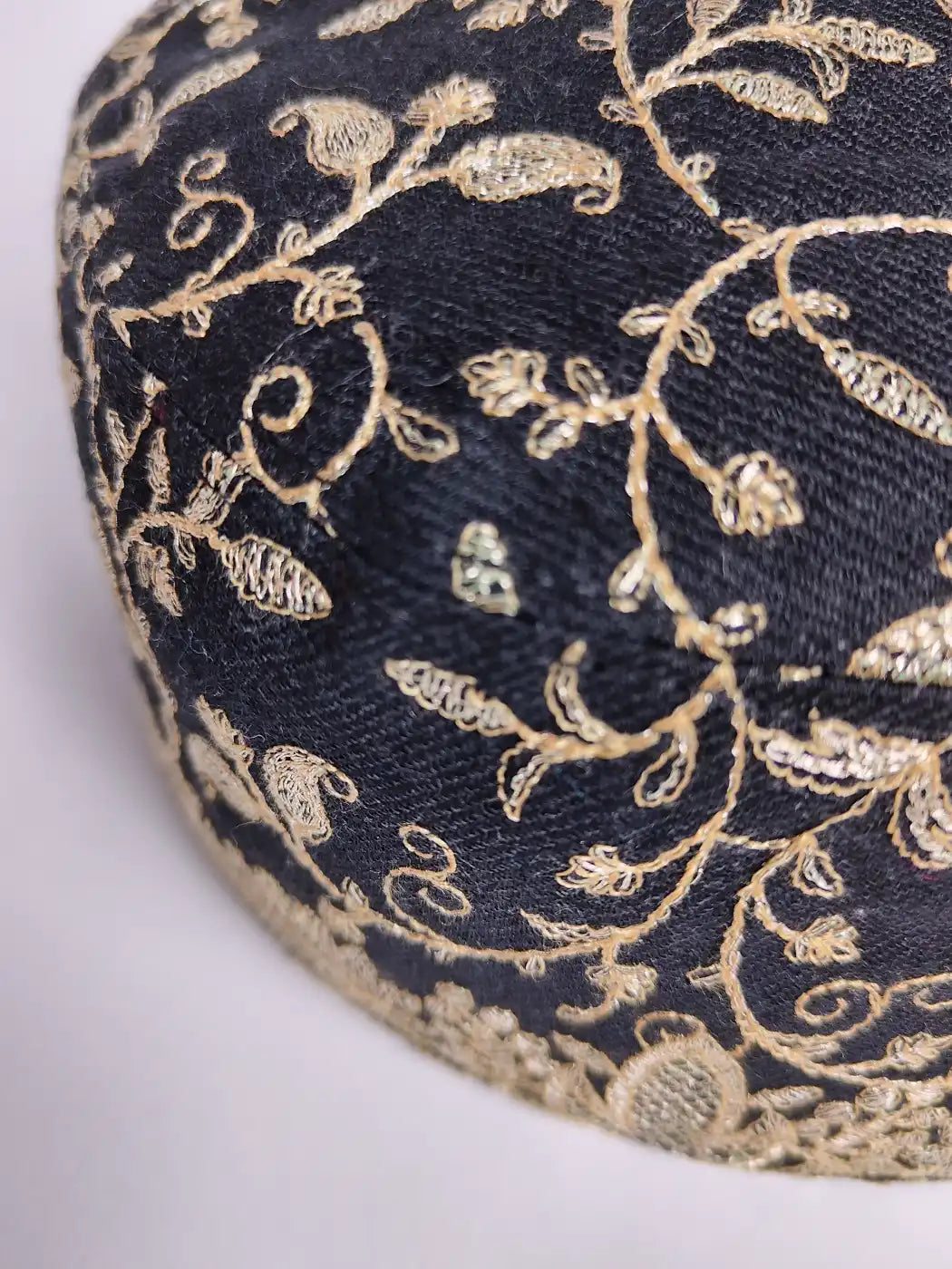 This white colour cap is made in wool for gents. It displays tilla zari embroidery, allover in vine and badam motifs, giving depth and shine. It brings tradition, grace, and a dignified presence to attire.