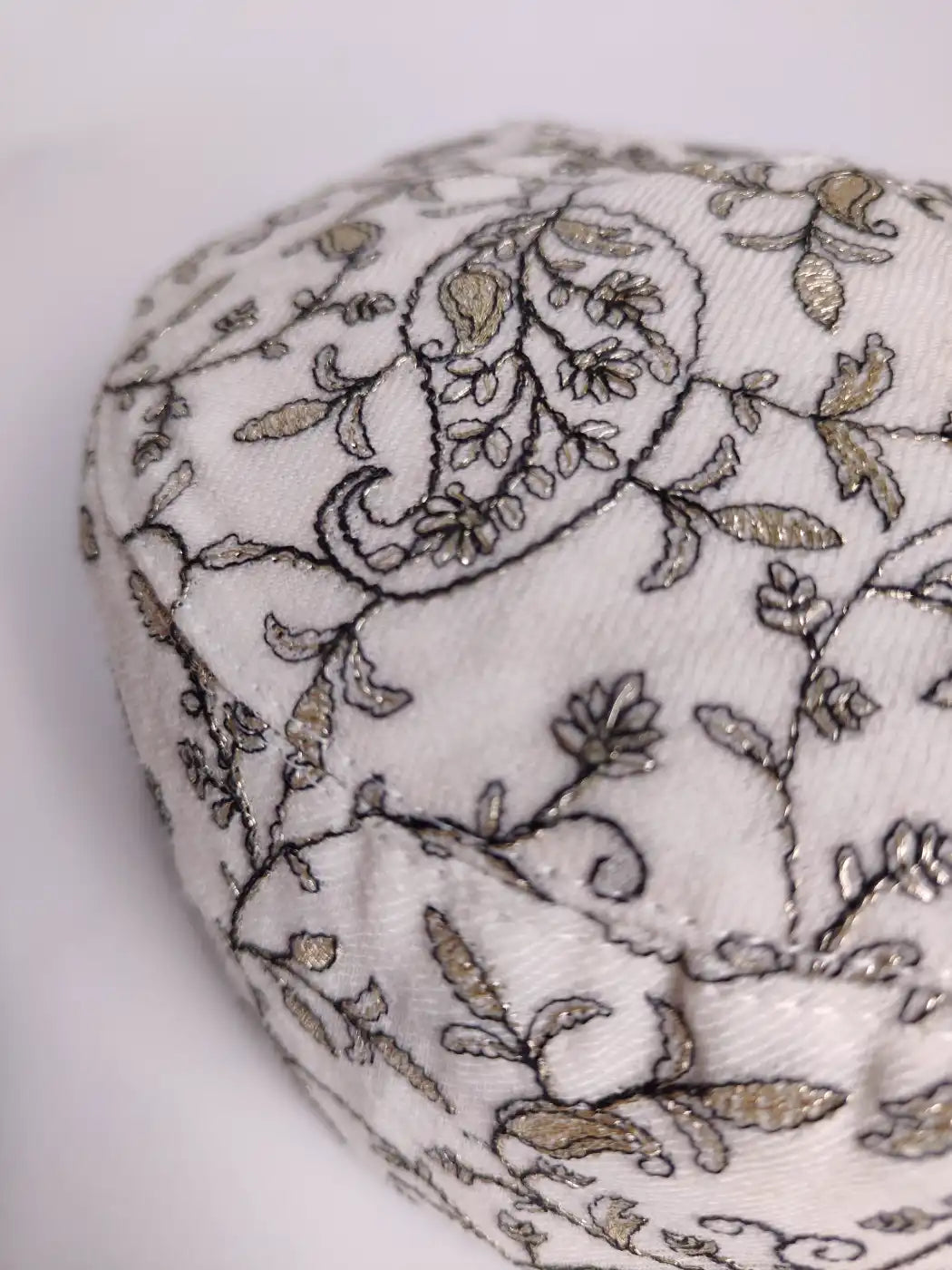 This white colour cap has been created from wool. It shows tilla zari embroideryin vine patterns, set all over it to adorn beauty and detail. It is ideal suitable for gatherings and occasions.