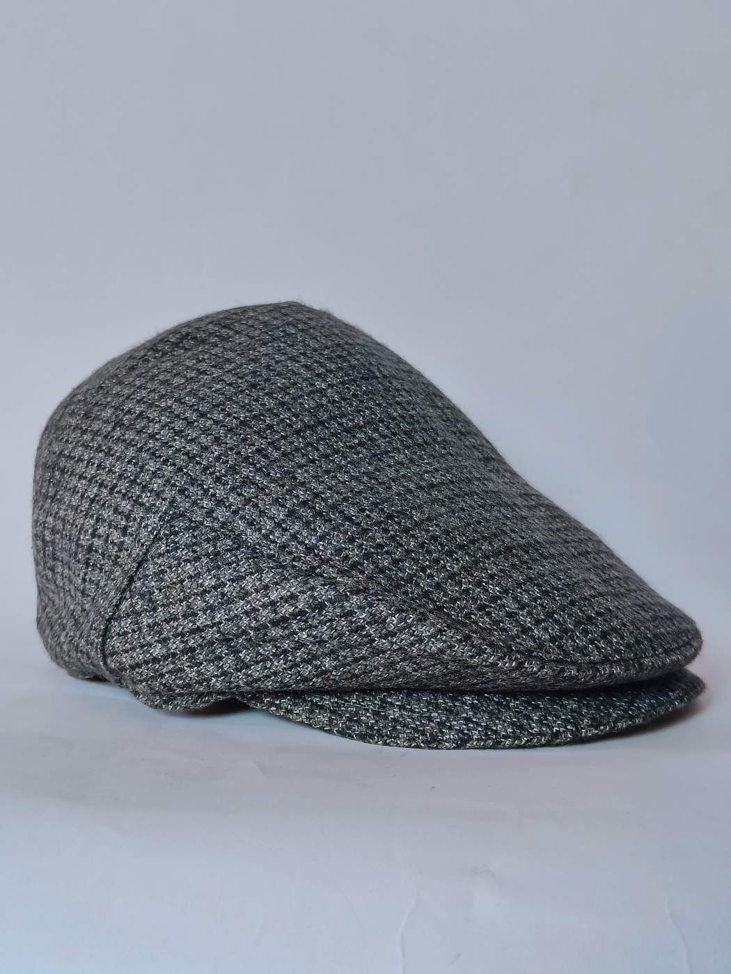 Order this greyish black striped flat cap, also known as a golf cap or ivy cap. It's a soft, rounded cap with a small, stiff brim in front. The cap is made of a durable, wool fabric. It has a classic, timeless shape often associated with traditional golf or baseball attire.