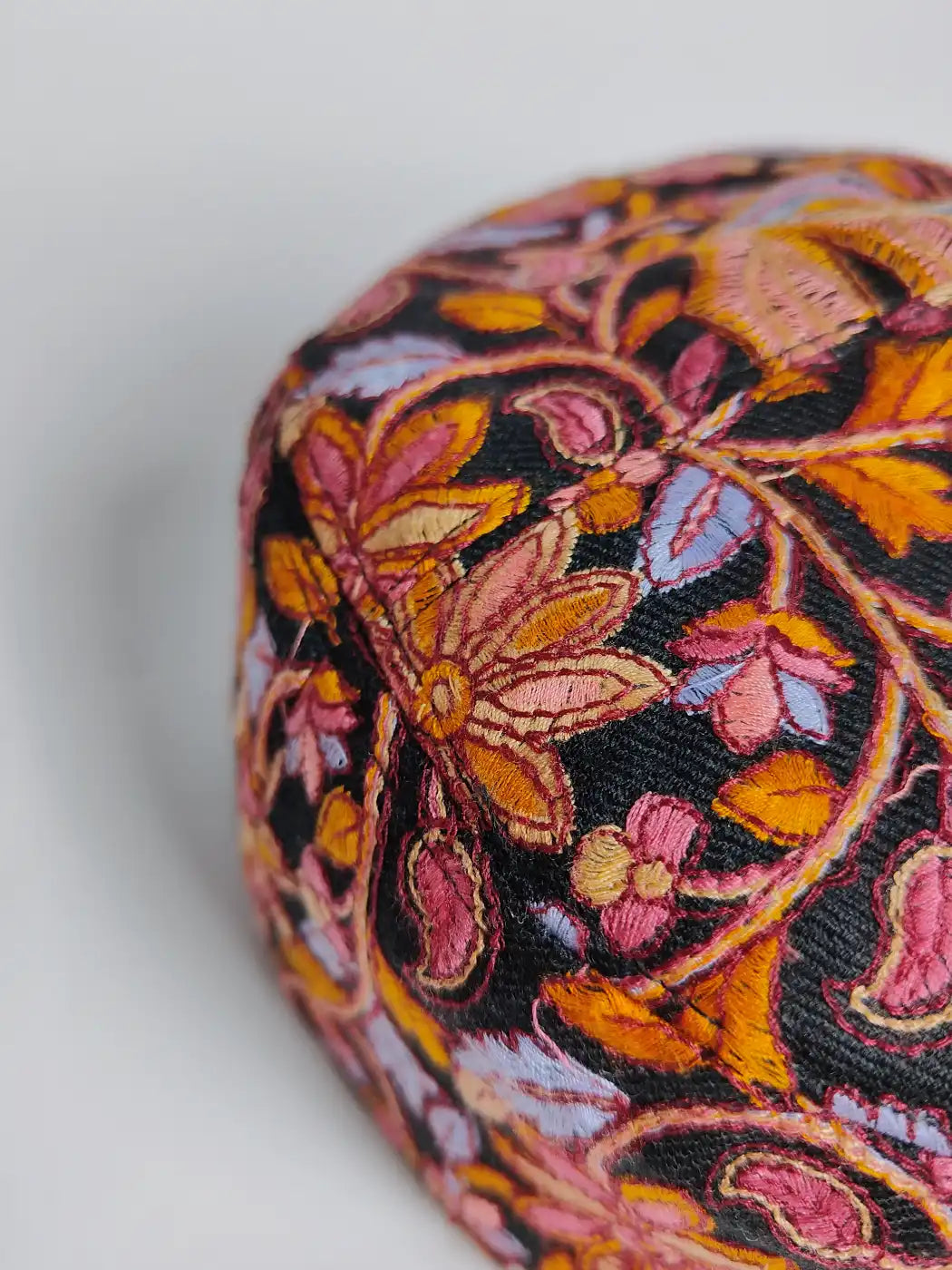 Made in wool, this black colour foldable cap showcases paper machie sozni needlework, in floral motifs, enriching the beauty. It provides easy fitting with its 22.5 inches size which makes it perfect for gatherings and special occasions.