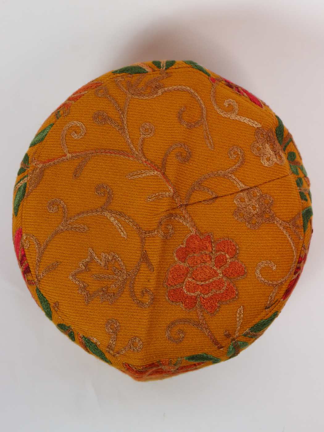 This round cap for men is in mustard colour. It reflects Kashmiri roots, with floral design around borders. With its classic design and exquisite craftsmanship, this piece is a timeless addition to any collection, cherished for years.