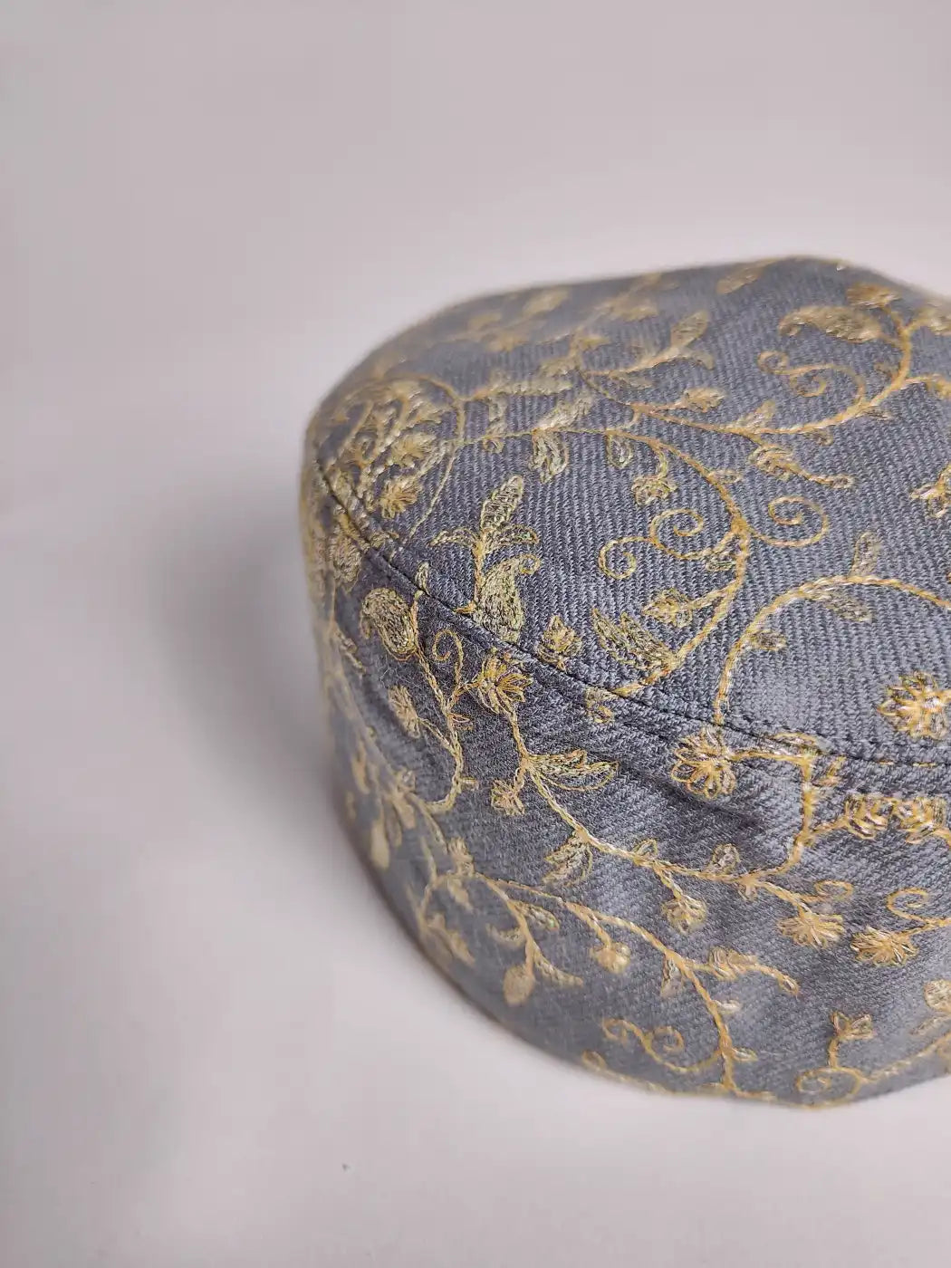 Fine wool material in black colour foldable cap holds detailed tilla zari embroidery in vine and badam patterns, the embroidery is placed all over it to add shine and beauty.