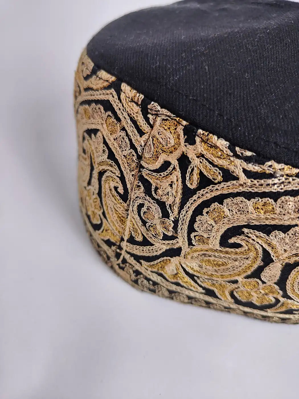 Designed in wool, this black colour caps for man showcase tilla zari work that showcase continuous badam patterns along sides and plain top. This cap is ideal for special occasions, adding tradition, grace, and a refined presence to attire.