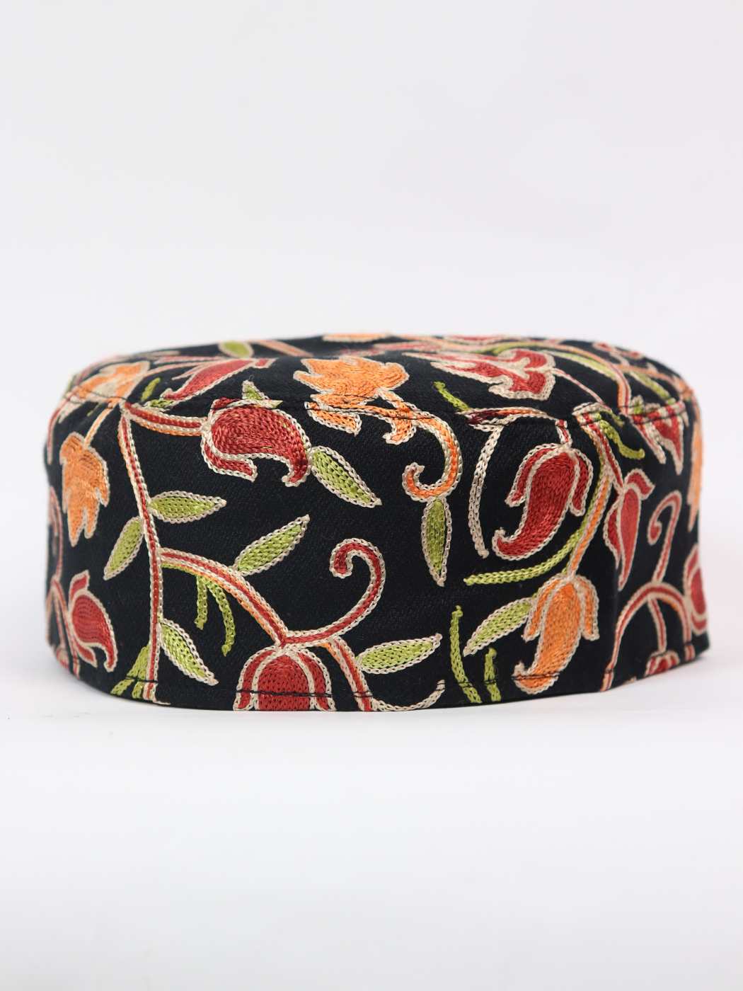 This black traditional cap for man offers refined simplicity. It showcase Kashmiri heritage, and it is decorated with chinar and badams around borders, which add cultural elegance in a subtle way.